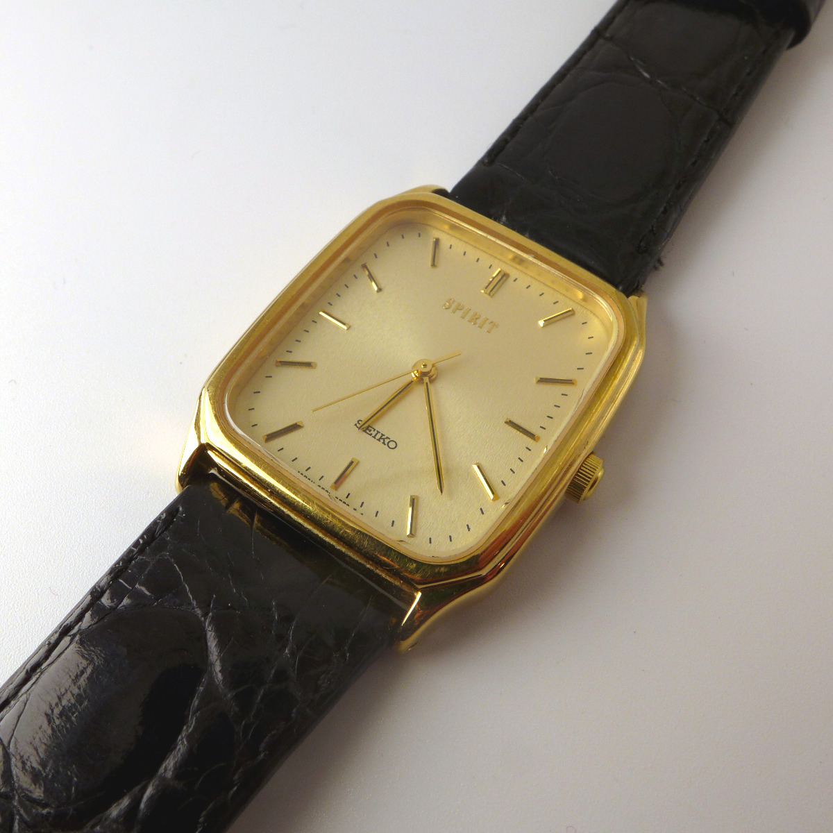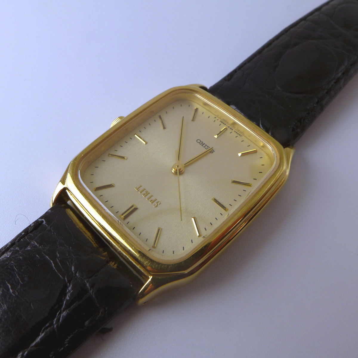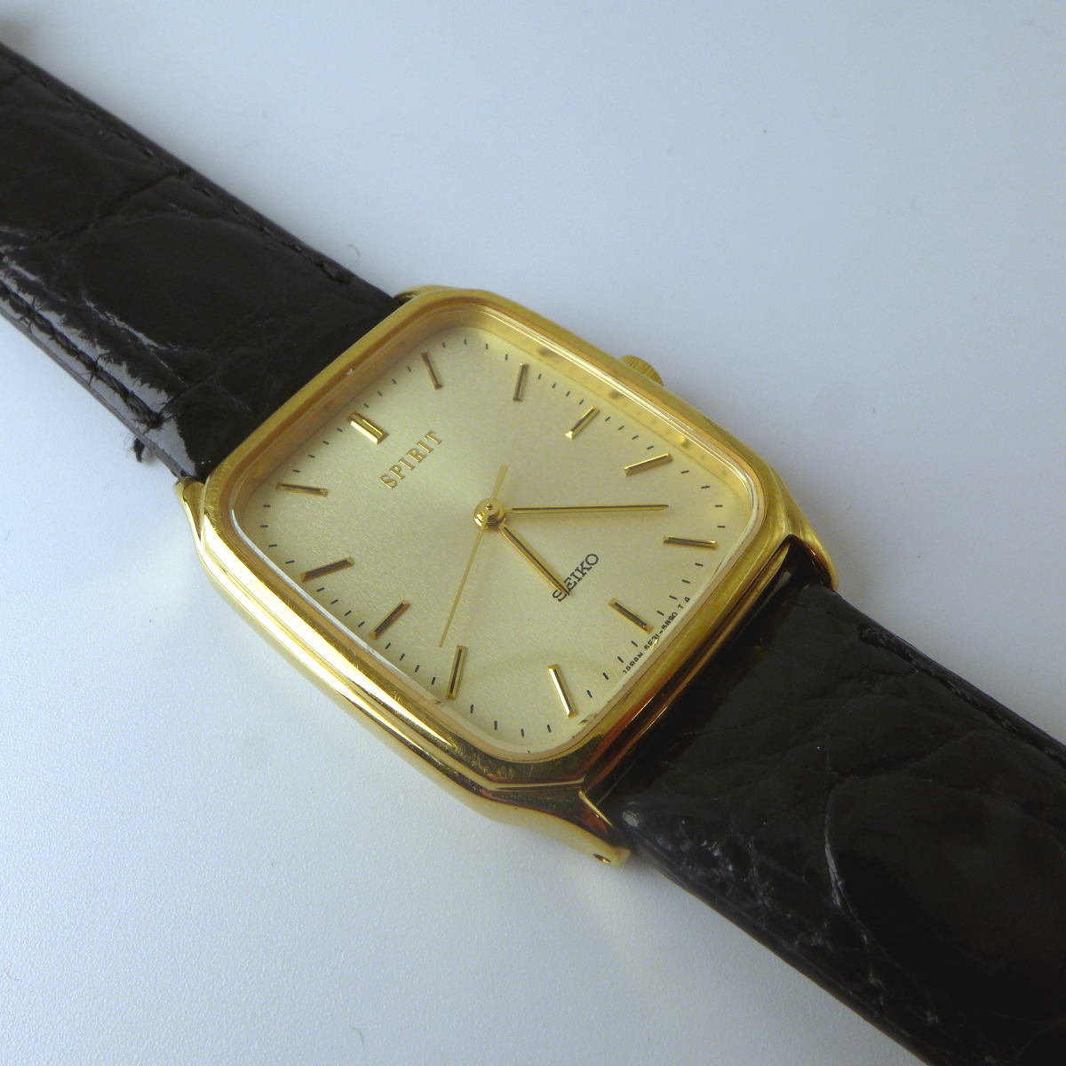 A Seiko Spirit watch, model SCEX028, from 1991 in nice condition. The watch uses the High Accuracy 5e31 quartz movement, rated to a respectable +/- 20 seconds per year. The SGP gold plated case has a factory Sapphire crystal and offers 60G Anti-Magnetic protection.. The strap is an aftermarket Bambi brand, though with original Seiko buckle.