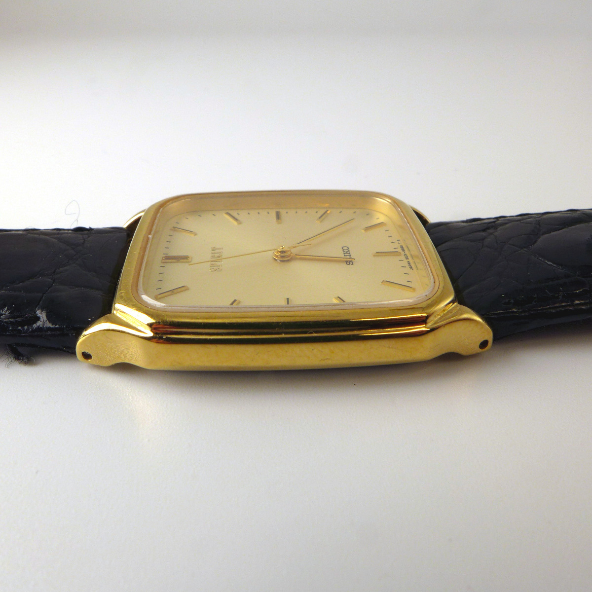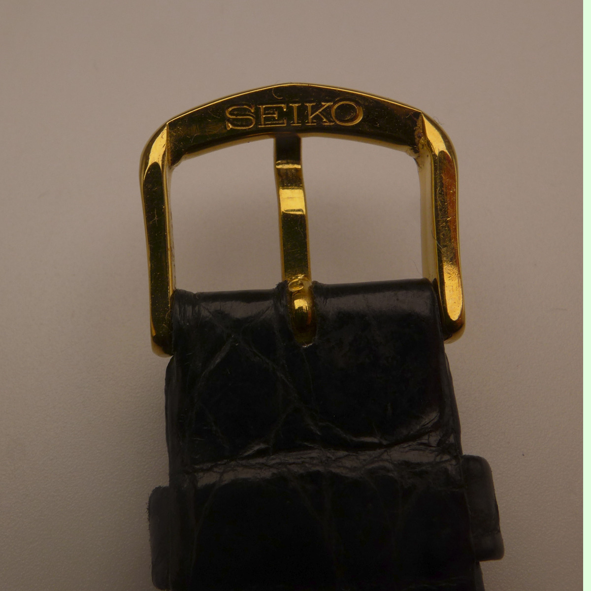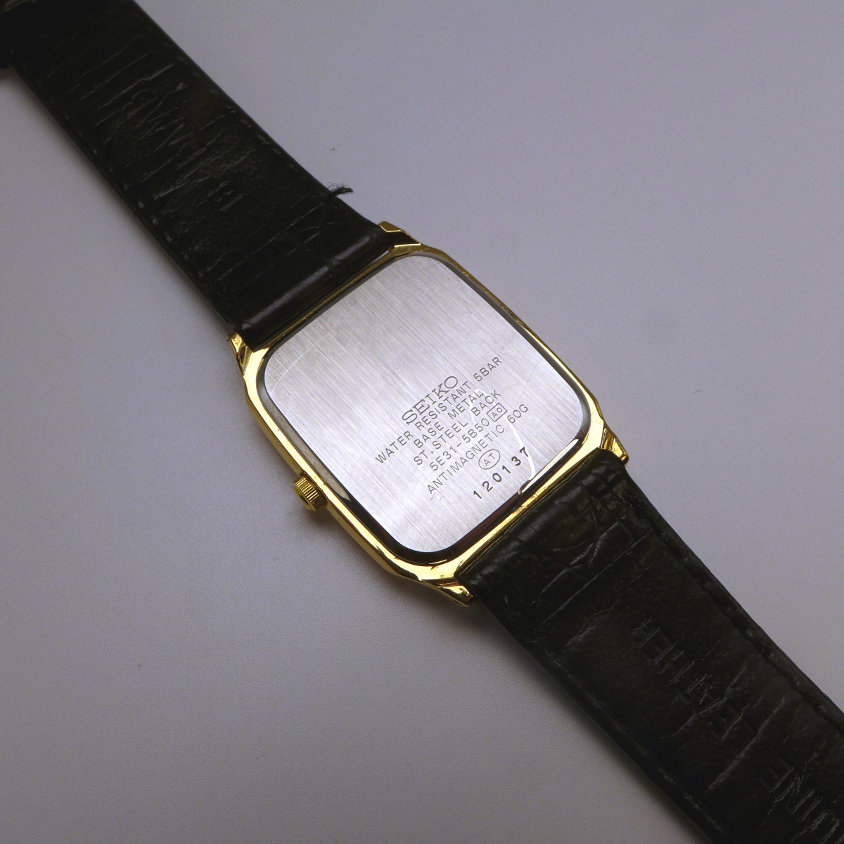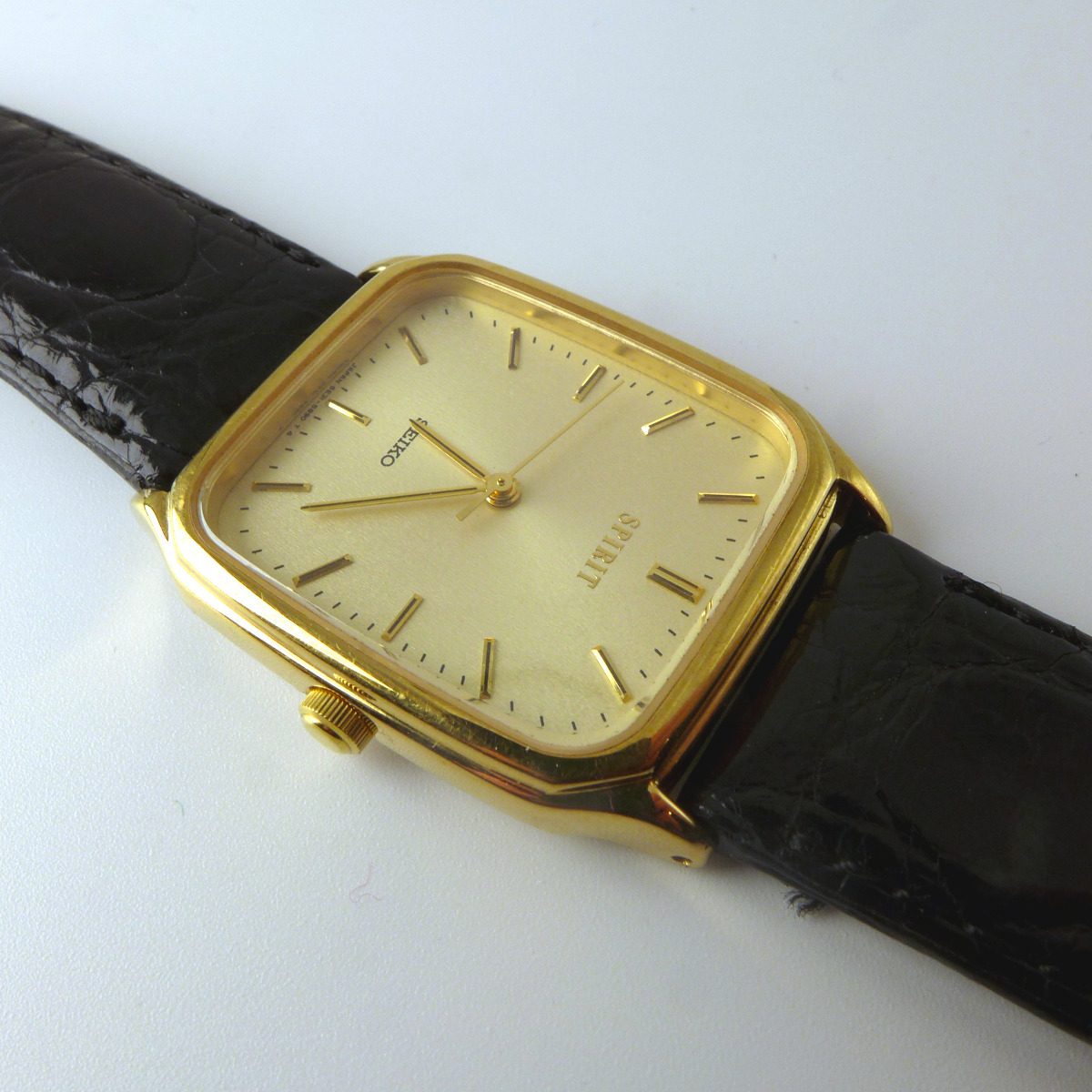 A Seiko Spirit watch, model SCEX028, from 1991 in nice condition. The watch uses the High Accuracy 5e31 quartz movement, rated to a respectable +/- 20 seconds per year. The SGP gold plated case has a factory Sapphire crystal and offers 60G Anti-Magnetic protection.. The strap is an aftermarket Bambi brand, though with original Seiko buckle.